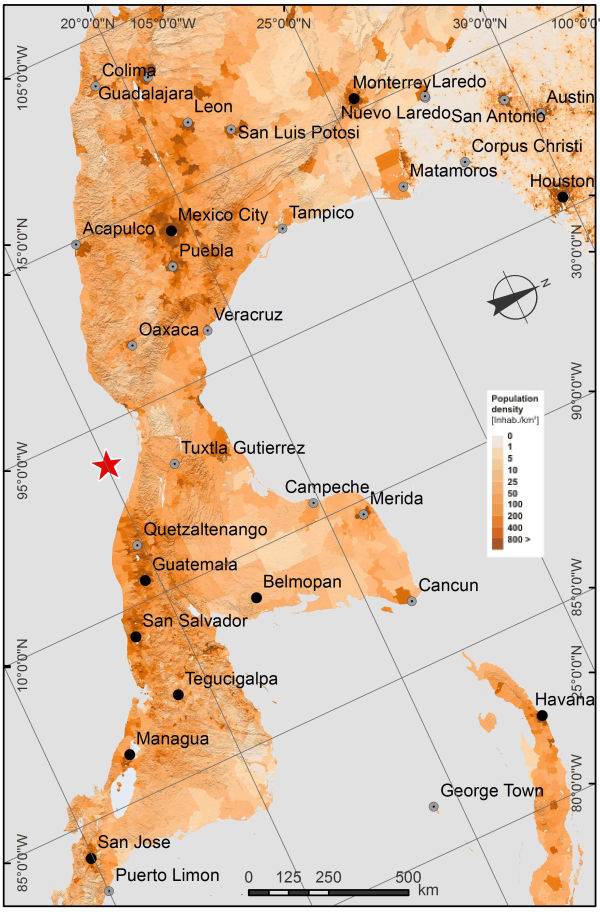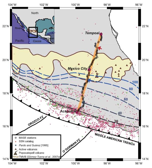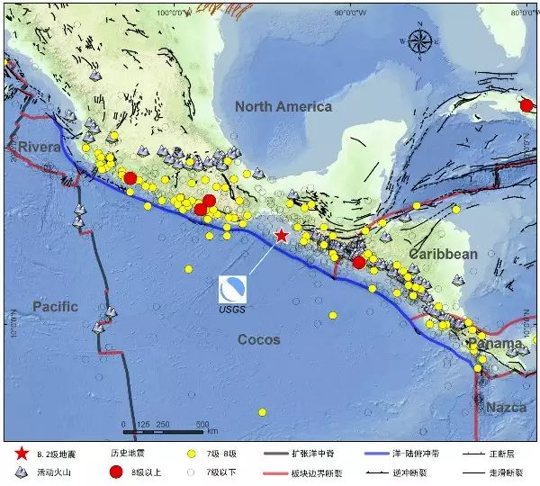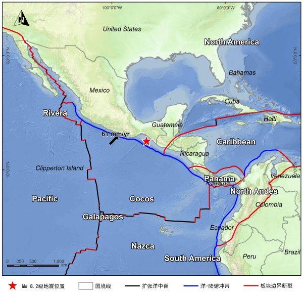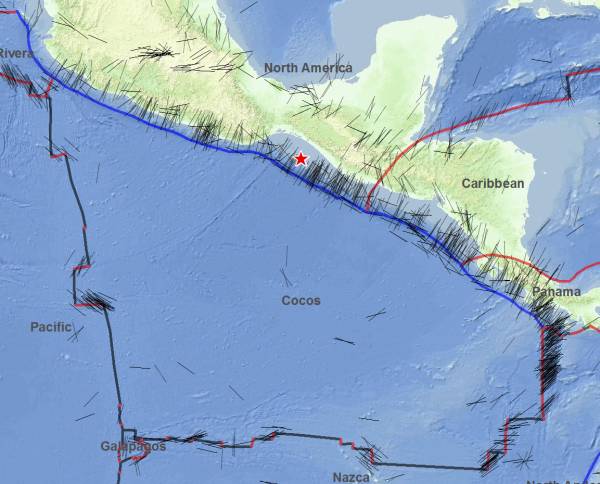 先看大地构造图,地震发生于墨西哥西海岸,Cocos 板块与北美板块的俯冲带上。其北段与著名的美国西海岸圣安德烈斯断层相连,北面的大型走滑断裂吸收了板块边界的变形,而到了美洲中部这一段形成了活跃的海沟,洋壳于此处俯冲带下插到美洲陆壳之下。