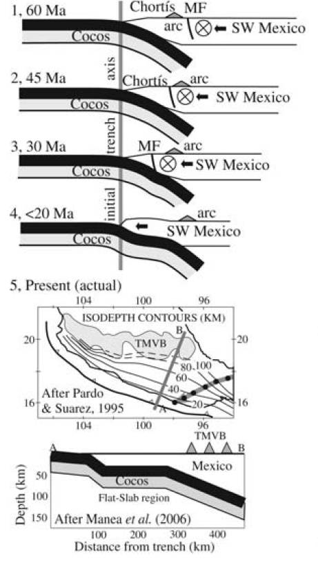 有科学家解释这种作用受控于洋壳俯冲速度与大陆漂移的不协调,主要体现为美洲中部板块向西漂移的速度大于洋壳下插的速度,因此近 4000 万年来美洲陆块逐渐挤压俯冲带,使其横向变形增生(下图)。