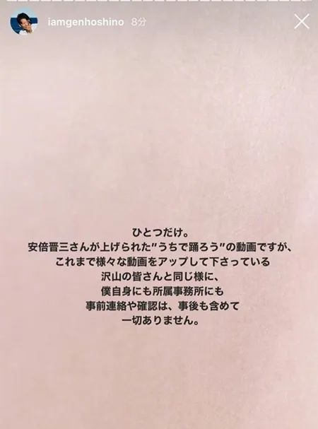 4月13日,星野源就安倍晋三首相公开视频一事,澄清表示“事前首相并没有和我联系确认”否定了二人存在合作或其他业务关系。