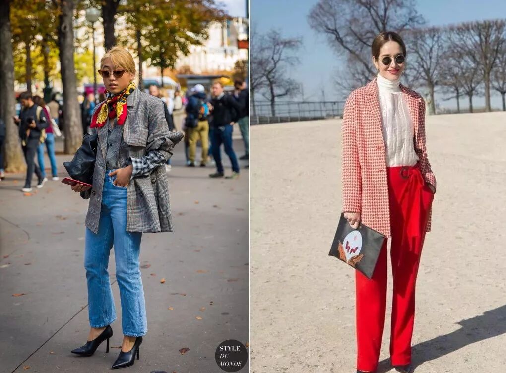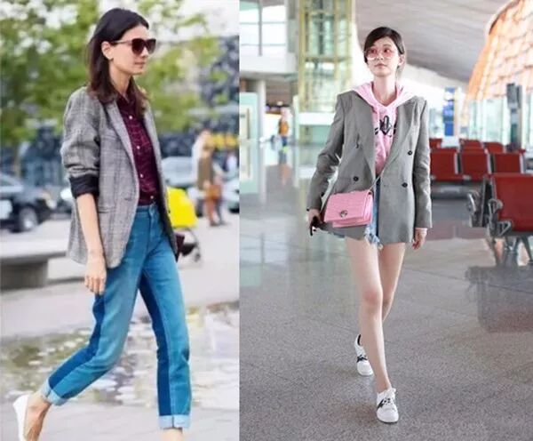 基于西装比较挺廓的特征,帅气不羁的性格与直筒阔腿裤非常搭,小脚裤反而有点收敛咯。最重要的是,大部分的西装都偏长,完全能够遮住胯部、大腿粗、屁股,显瘦利器。▲