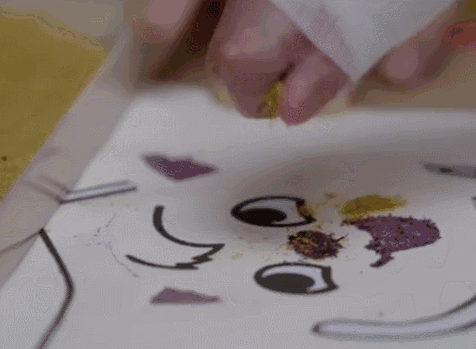 “妈妈”们就想出了办法,把不同颜色的树叶搅碎,就像砂画一样,让孩子们通过撒的形式作画。