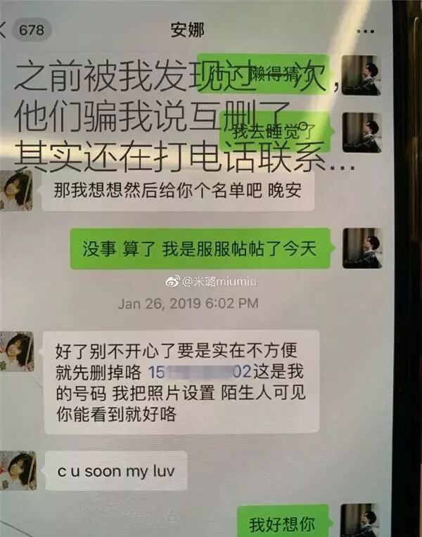 最后一张聊天记录显示,沈丹萍女儿安娜珊珊称要删掉联系方式,但留下手机号码并透露会将照片设置成陌生人可见,而“米璐miumiu”则解释之前两人被发现后互删,但实际上还在打电话联系,最后一句,“米璐miumiu”留下”我好想你“四个字,也算是能透露两人之间的关系确实是相当暧昧,疑似男方出轨。