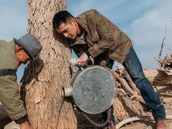 他还去了西北种树,一身磨损严重的夹克衫搭配被泥土弄脏的牛仔裤,看上去多了几分沧桑。