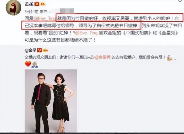 在台里被“一向敢说”的金星比下去时就发文暗戳戳嘲讽。