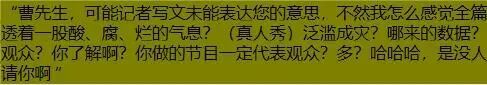只是她正火时,曹可凡面对镜头大批真人秀,说那都是假的,是低俗的,只能带动大众低俗的快乐,不能提高大众的精神高度。