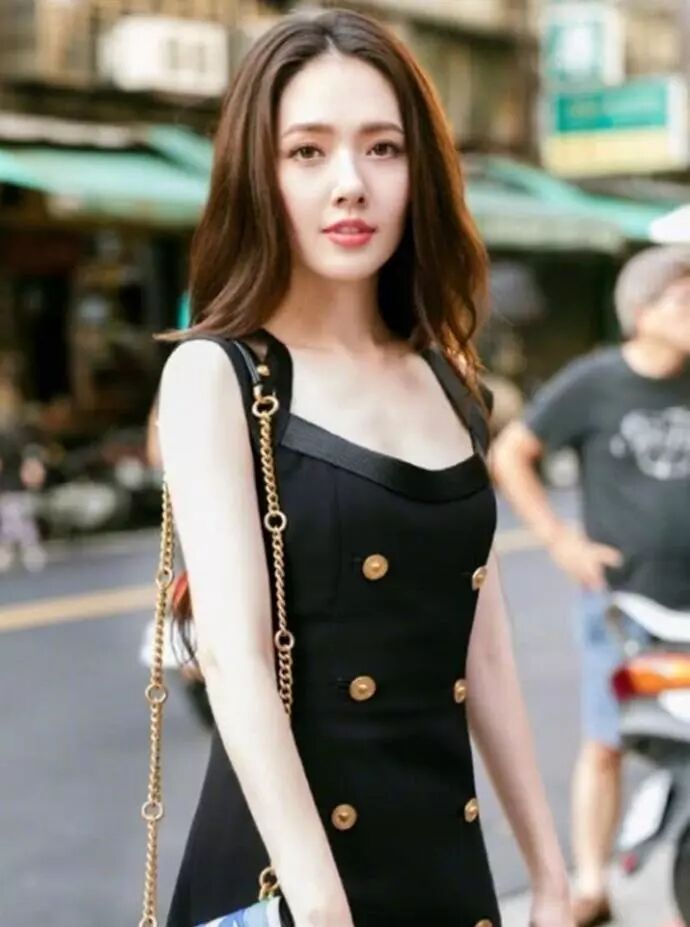 郭碧婷身上穿着一件黑色吊带连衣裙,看起来很是时尚漂亮,裙子上的扣子设计显得很有时尚感,裙摆开叉直接开到了“大腿根”,非常吸引别人的目光,很是性感撩人。