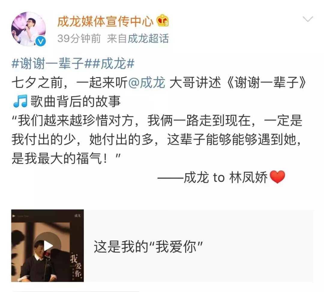 成龙选择在歌曲里说谢谢你,而不是我爱你,是一种情深,一种珍视,情深于36年间与林凤娇的相爱点滴,珍视于36年林凤娇的所有隐忍。