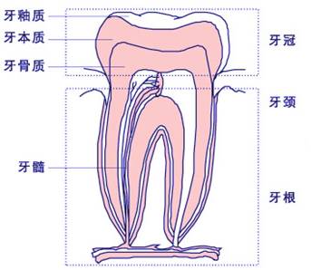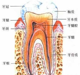 我们先来看一张牙齿结构图。牙的结构分为:牙根、牙颈、牙冠。
