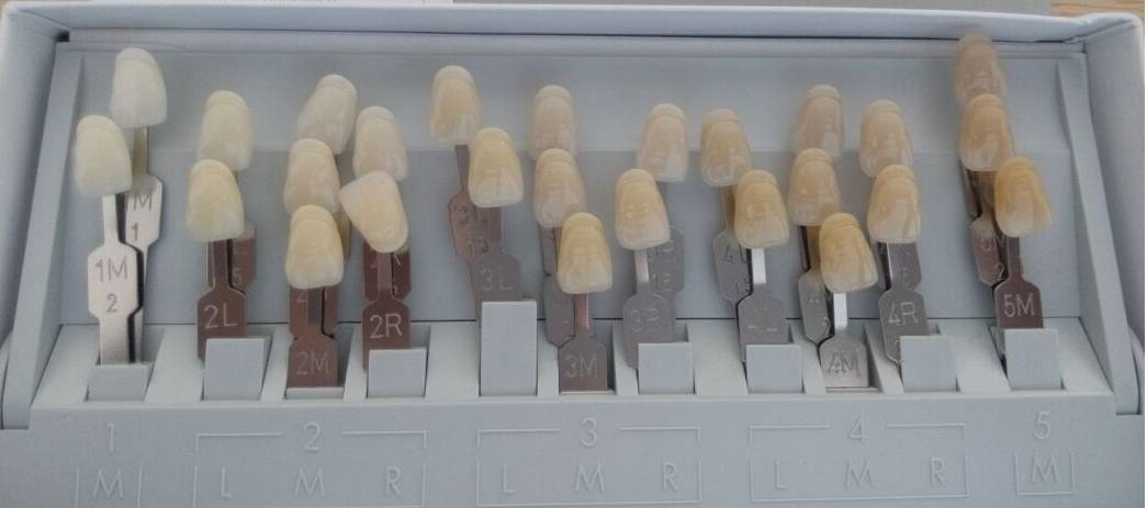 给大家看一个常用的牙科比色板。一般临床上比色先看亮度(1~5级),再看饱和度的选择,再决定色调。西方人的亮度一般比东方人更白一些。所以在选择亮度时也要结合自身的实际情况,不能单纯地只追求白,还要注意自然度。