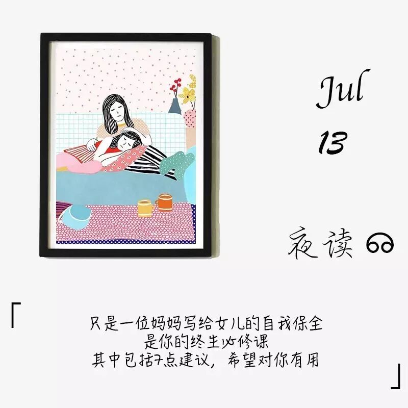 这是目前妈妈能想到的所有的事情。在你成长的过程中,会陆续有其他情况发生,我会随时调整。家有女儿,操心和担心就会多了一层,就算她长大了嫁出去,也一样会牵挂到肝儿疼。所以,孩子,随着年龄的增长,你会觉得妈妈越来越啰嗦,也会对妈妈越来越不耐烦,我都不会介意,还会一如既往。因为我相信,终有一天,你也会做母亲,会陪着她一起成长,会遇到我曾经遇到的同样的问题。