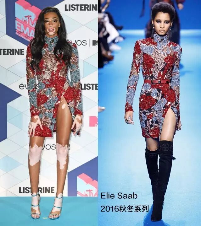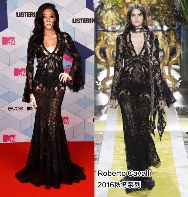 还有模特Winnie Harlow一身黑色蕾丝长裙走性感路线,但不知道为什么搭配这个发行以后有种不肯服老的中年既视感▼