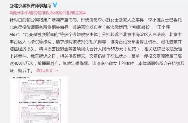 李小璐方称本以为可以随时间而一切归于平淡,没想到事情越演越烈,才不得不站出来。而在此事件中的多个账号已被分别起诉至北京市海淀区人民法院、北京市丰台区人民法院等法院,请求法院依法判令相关侮辱、诽谤言论发布者停止侵权、赔礼道歉并赔偿经济损失、精神损害抚慰金等各项损失合计人民币55万元(每案)