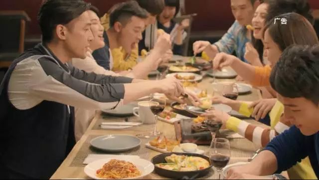 广告里所有分享故事的人一起在必胜客餐厅分享了美食~毕竟披萨太大了,必须分享着吃才能吃完~