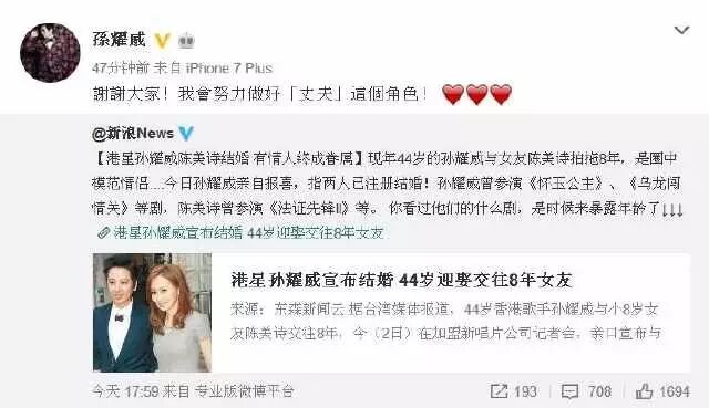 前几日,孙耀威在加盟新唱片公司记者会上亲口宣布与女友陈美诗早前在美国注册结婚。他称:今天是一个重要的日子,我要宣布一件人生重要的事情,就是目前已经和Macg(陈美诗)在美国注册结婚了。