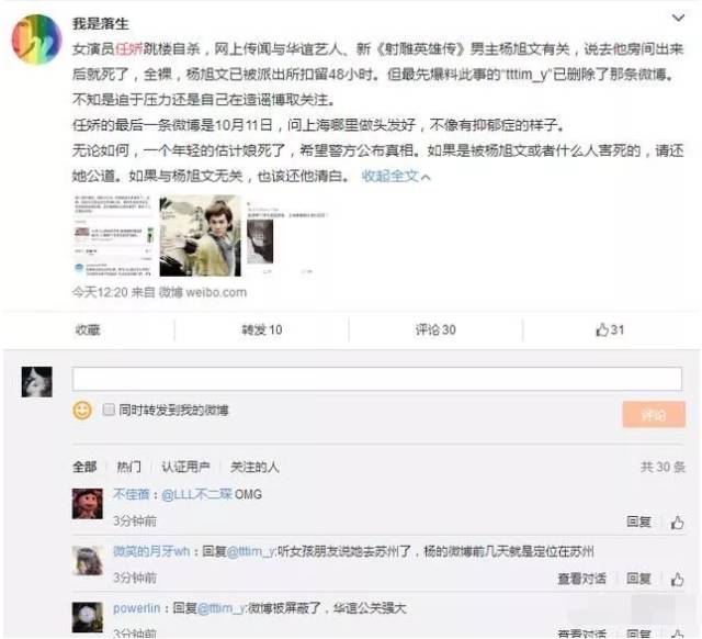 又如果真的只是抑郁症轻生,为何会出现这么多指向杨旭文的“谣言”?