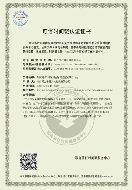2017年,金堂奖委托中国首家设计版权经纪平台——喜舍创享,联手国家唯一权威的可信时间戳服务机构(TSA)首次对508件年度优秀作品的电子数据版权进行了确权,签发了具有法律效力的可信时间戳电子证书,开创了中国室内设计行业知识产权保护的先河。