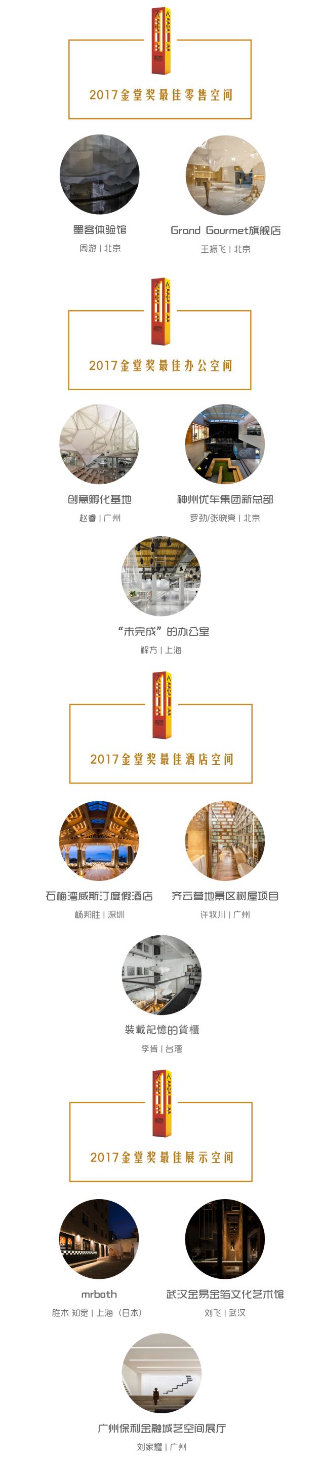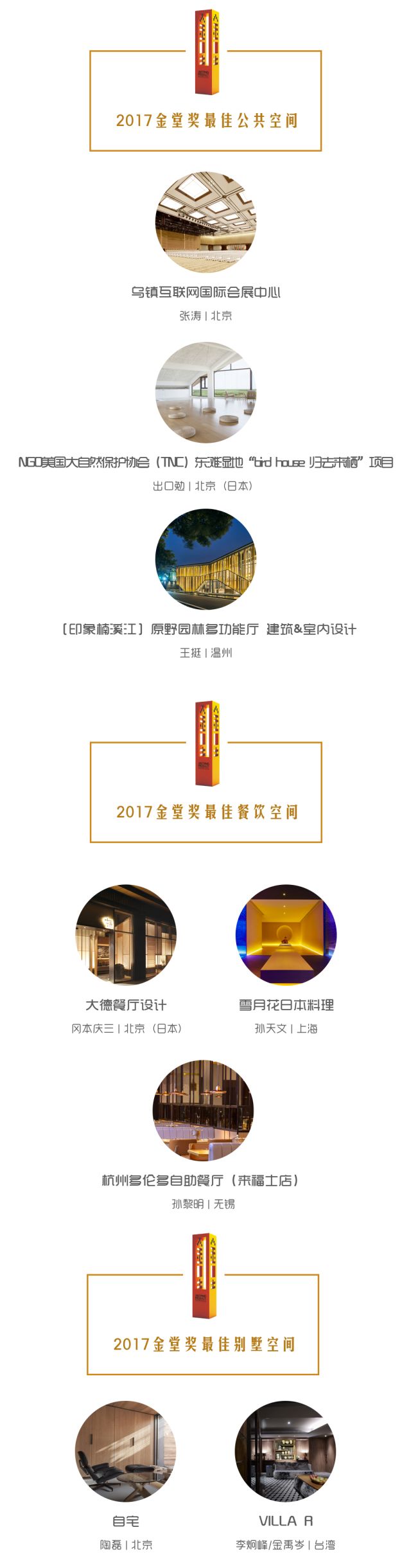 2017金堂奖评选范围涵盖中国境内年度最具代表性的公共、酒店、办公、购物、餐饮、娱乐、休闲、别墅、住宅、样板房10个类别数千件室内设计竣工作品,通过国内外享有权威知名度的设计业主、专家、学者、媒体主编以及超过百万专业设计师通过网络参与投票,产生最具关注度、影响力、公信力的中国室内设计年度评选结果。同时组委会还设置了年度新锐设计师,鼓励8090后优秀的设计师脱颖而出;设置的评审委员会特别大奖,将对行业做出重大贡献的功勋和元老给予最高认可和表彰。