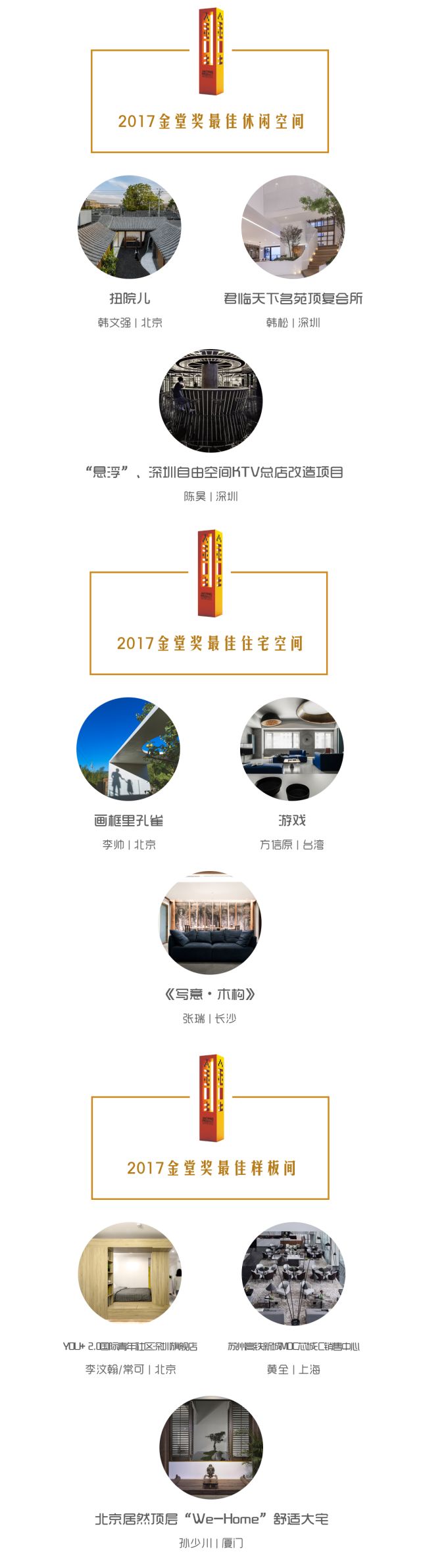 2018年3月17日,金堂奖·中国室内设计年度评选2017成就盛典在黄山秀里盛大举行,来自中国室内设计业界的知名大咖、著名设计师、行业媒体精英、获奖设计师、全国50多省市的设计师服务机构代表汇聚一堂,共同见证中国室内设计产业的此次盛会。在成就盛典上,在经过一年多全国室内设计师优秀的作品的征集之后,最终有508件作品获得年度优秀作品;28件作品脱颖而出,成为年度最佳室内设计作品;同时金堂奖评审委员会还正式揭晓发布了年度最佳新锐设计师、组委会特别大奖等。