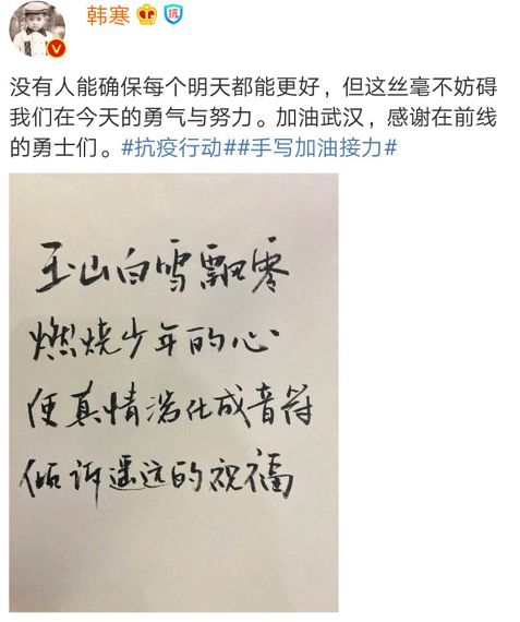 韩寒时刻挂念着家乡的疫情防控工作,此次,他为家乡抗击疫情和医疗卫生建设捐助100万元,同时,在抗疫物资非常紧缺的情况下,他还想方设法从国外购买一台ECMO及医疗耗材将送往湖北抗疫一线。