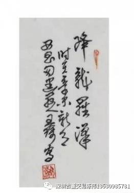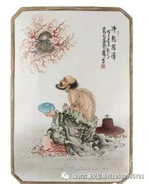 近日深圳雍轩艺术馆有幸征集到一件王琦款降龙罗汉瓷板画,其瓷板画长36cm,宽24.5cm。王琦先前受清代画家黄慎影响,人物画以狂草画法为主,降龙罗汉手拿法器,身着袈裟辟地露背,抬头望天空邪龙,其神态逼真,降龙罗汉本是天上神仙,瓷板画又是以瓷入画,以胎为纸,使用特殊的化工颜料手工绘画、上釉,再经高温烧制而成的一种平面陶瓷工艺品,烧制成功后更是给到世人可望不可及的视觉效果。