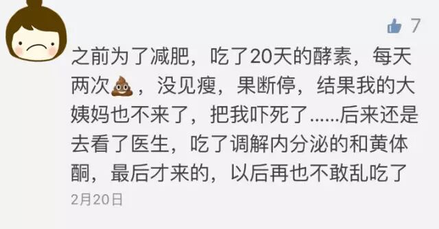 下面是一位妹纸在我们微信后台留的言,说自己吃酵素减肥的后果,看哇!还以为我们是在乱说哇?!