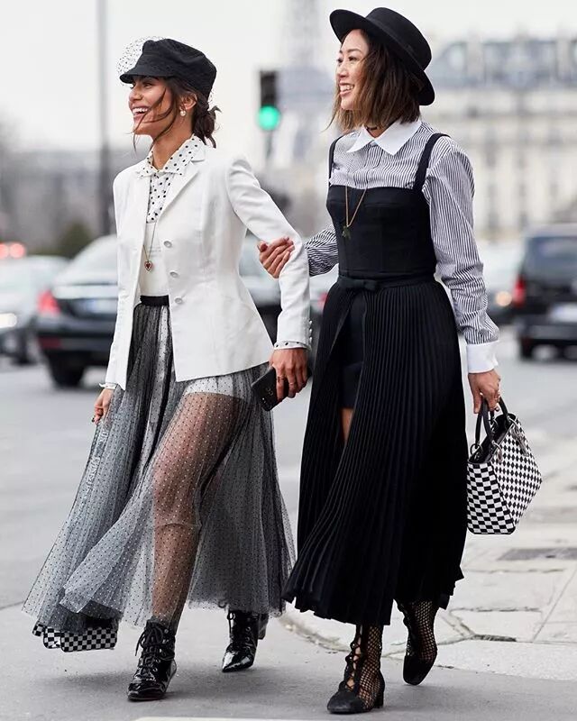 长透视纱裙,特别喜欢这种仙女范的时髦精们可以尝试下,但这样长度的半裙,上衣要选择短款的夹克和紧身的内搭更适合。