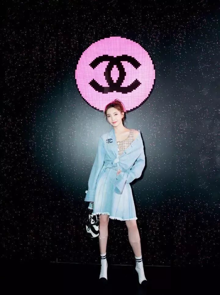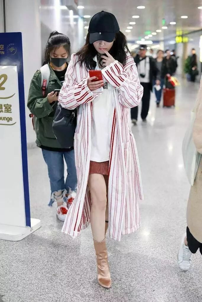 江疏影的筷子腿,终于熬到了夏天,牛仔衬衣搭配同色系半身裙+人人都在吐槽的透明鞋,袜子加的刚刚好,腰部打结会有收腰的效果。