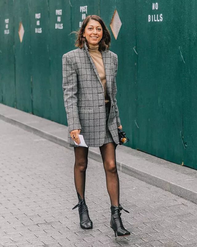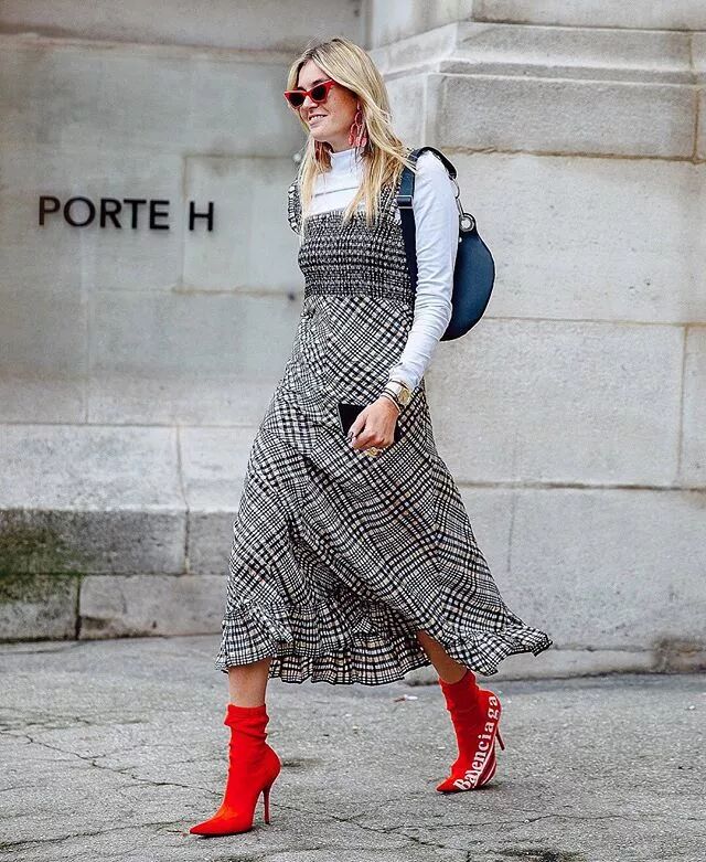格纹的连衣裙+长袖白Tee,又是初春的必备,袜靴突显时髦感和长腿的必备利器。