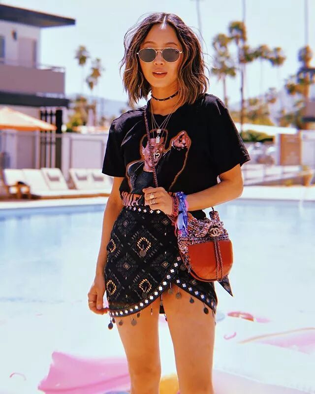 气温飙升的最佳搭配方式:短袖+mini半裙,其实现在还没有到这么热,但是像这样个性T恤和半裙的混搭,是最简单易学的。