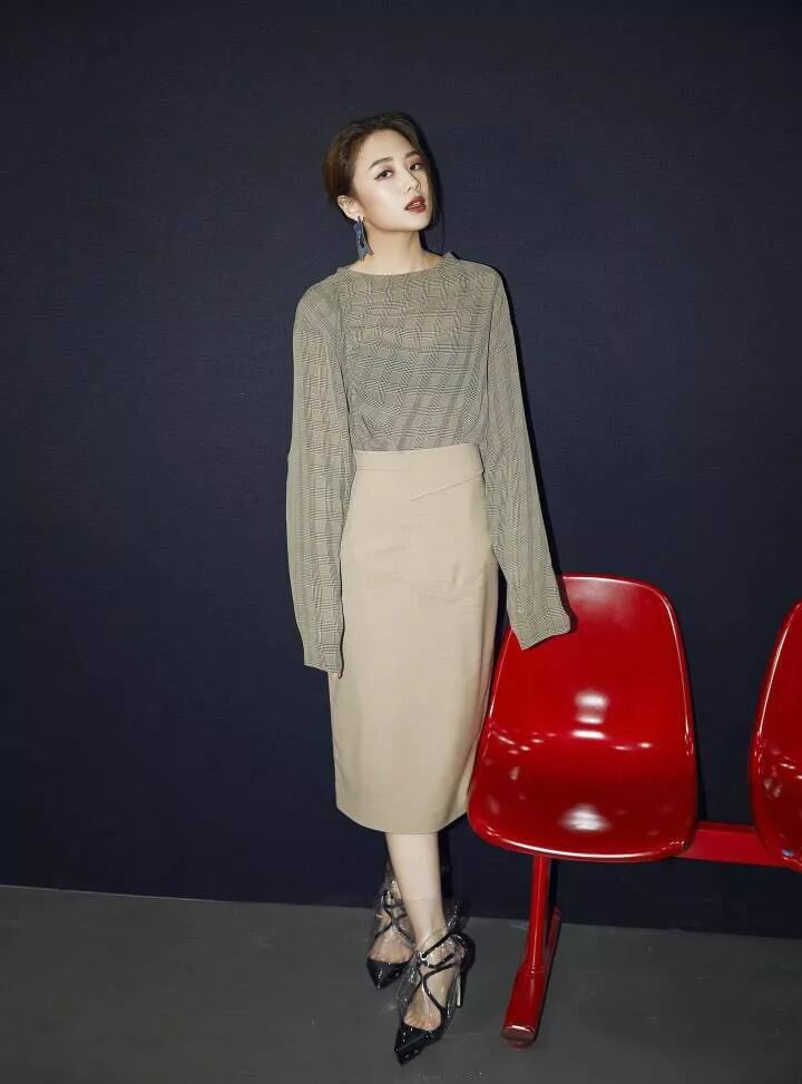 鬼鬼吴映洁用佛系的色调混搭JimmyChooxOFF white 的合作款高跟鞋,小露性感的透视上衣+中规中矩的半裙,亮点全在鞋上。