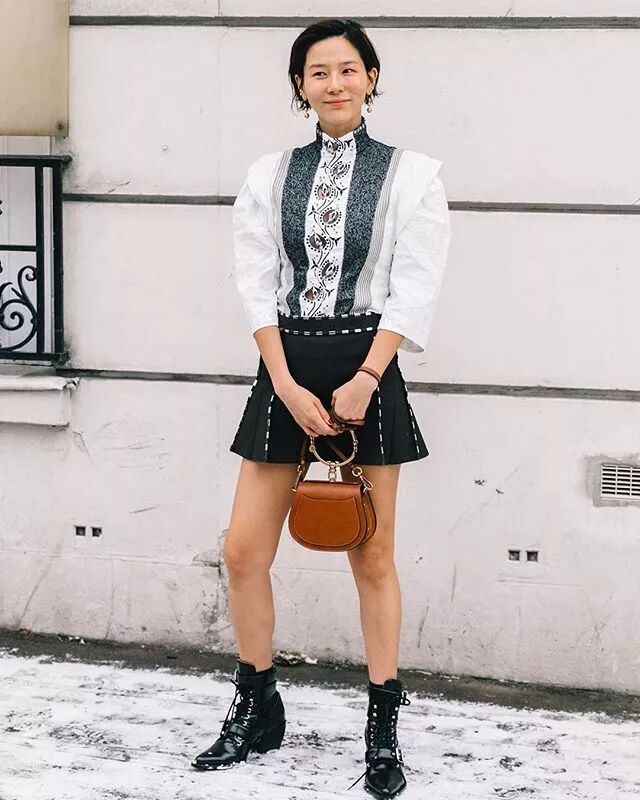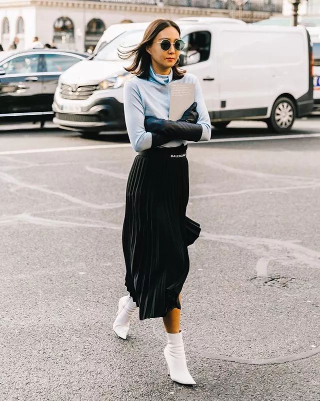 宫廷风的搭配,个性的印花衬衣+黑色的百褶裙和机车靴,很适合有身高优势的仙女,怕显胖的妹子可以选择长款简单的百褶半裙。