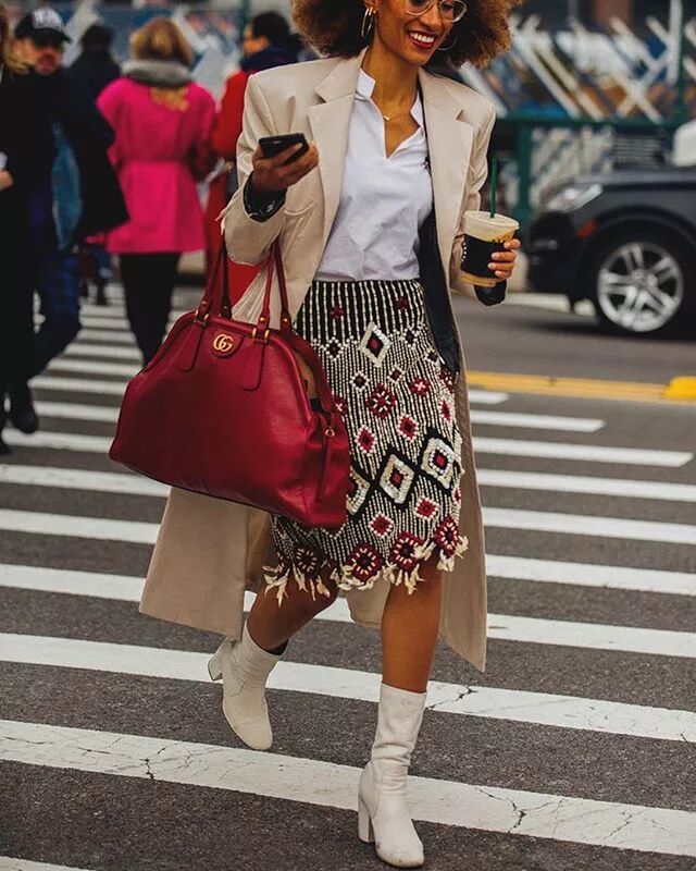白色的衬衣略显平淡单调,那么就需要搭配夸张印花细节的半裙,到膝盖的长度,刚好遮住大腿肥肉,高跟短靴又会拉长比例。