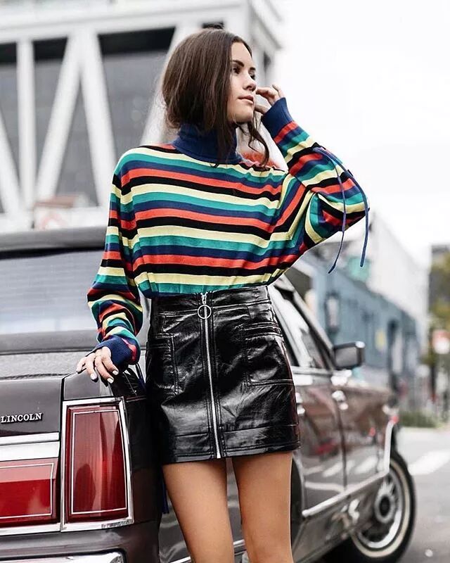高领轻薄的针织衫+A字mini半裙,季节性的混搭方式,在变化莫测的气温下,非常实用。