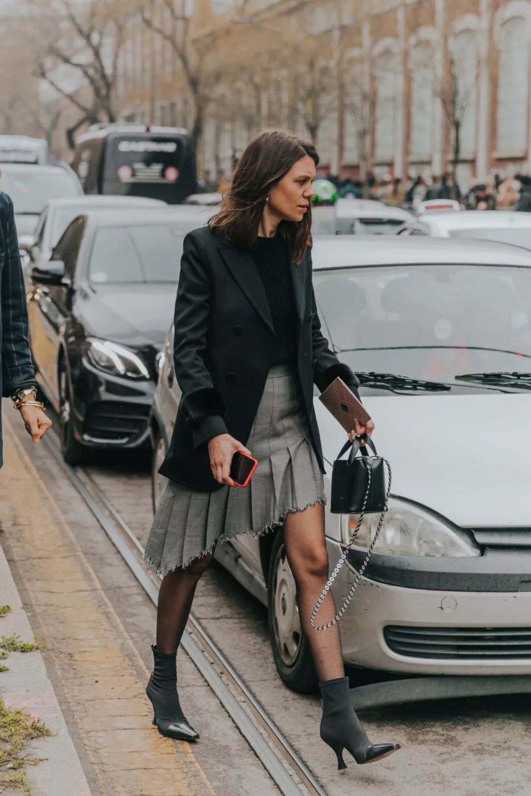 西装外套不能少,各种裙装都能轻松搭配,黑色的职业西装+不规则剪裁的半裙,中和了上身的正式感,变得更加高级的混搭。