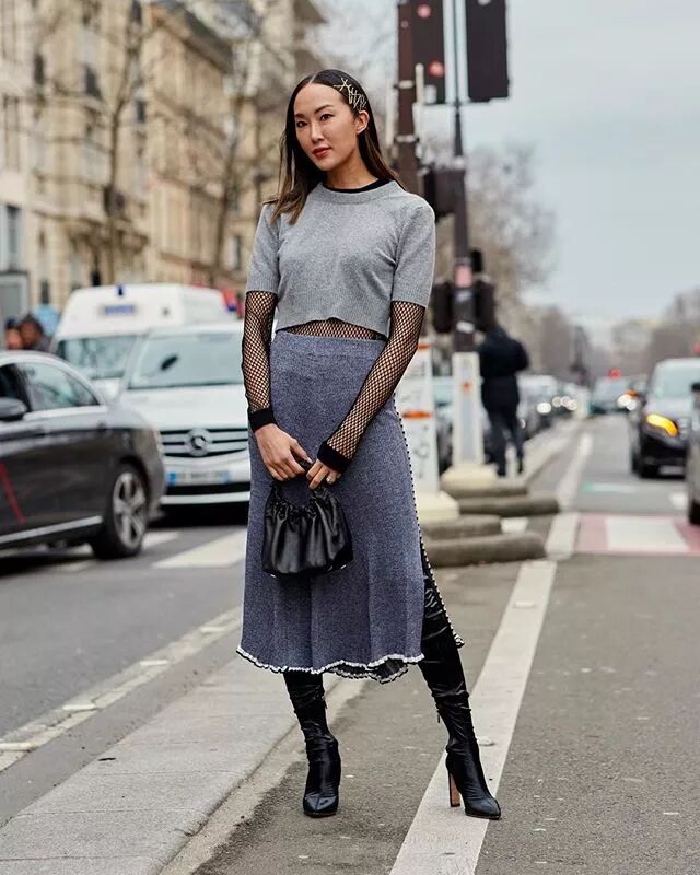 渔网长袖+T恤的搭配有点夸张,摇滚的感觉,可以选择透视的长袖内搭,增加视觉上的华丽感,裙装+长靴也是掩盖小粗腿的好方法。