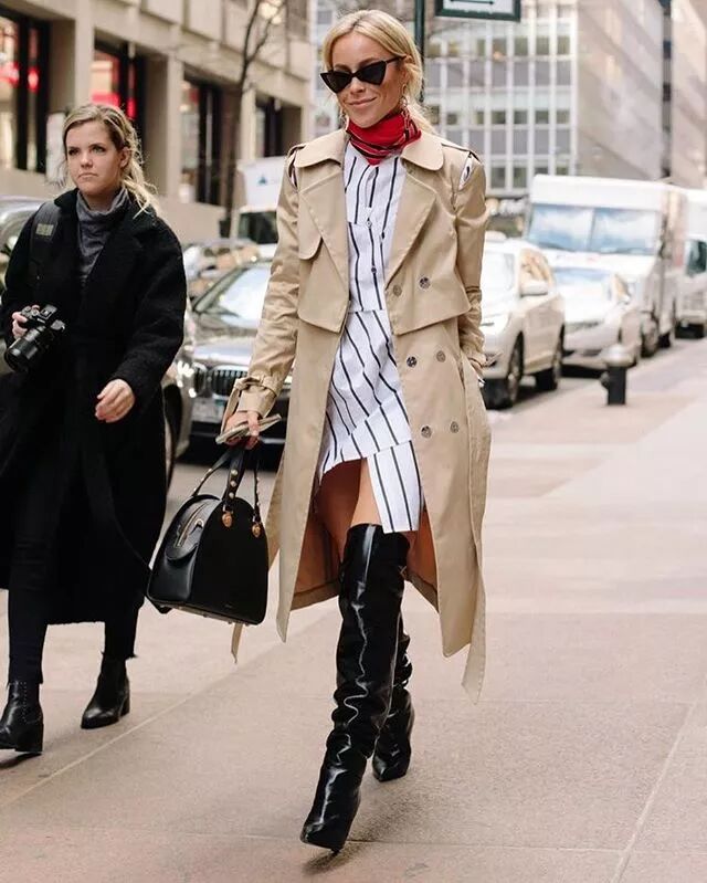 初春是最适合穿风衣的时候了,轻薄又抗风,鞋子可以选择小白鞋或者牛津鞋都可以,黑色的长靴有点太正式。