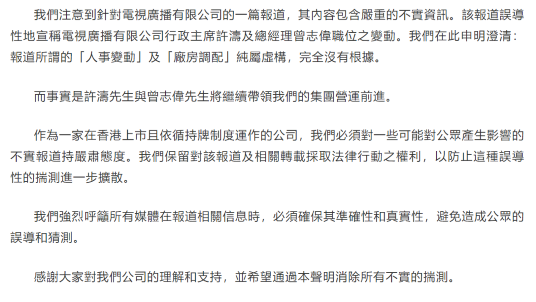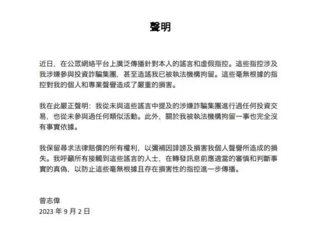 “曾志伟被拘?”最新回应→ 广州日报 港台男星 2023-09-03 08:23:56 275 创作不易,用心坚持,欢迎请BaGua喝几杯爱心咖啡!打赏并支持本文 打赏并删除本文 近日,网上有消息称,香港无线电视总经理曾志伟被查出入股缅北诈骗集团,已被香港执法机构调查。对此,香港警方已经向媒体证实消息不实。9月2日,曾志伟发布个人声明澄清事件。曾志伟资料图。来源:香港文汇网“曾志伟入股缅北诈骗集团?”最新声明:不实!近期,多个平台网络文章将TVB总经理、资深主持人“曾志伟”和“缅北诈骗集团”联系到了一起。还有传言称,曾志伟已被香港执法机构带走调查。据香港文汇报消息,对此,香港执法机构回应:消息不实。9月2日,曾志伟发出声明:声明显示,近日,网络平台上广泛传播针对曾志伟的谣言和虚假指控,涉及曾志伟涉嫌参与投资诈骗集团,甚至造谣已被执法机构拘留。曾志伟严正声明,从未与这些谣言中提及的涉嫌诈骗集团进行过任何投资交易,也从未参与过任何类似活动。此外,关于曾志伟被执法机构拘留一事也完全没有事实依据。他保留寻求法律赔偿的所有权利,以弥补因诽谤及损害个人声誉所造成的损失。曾志伟要离开TVB?无线回应据悉,现年70岁的曾志伟8月中旬在台湾接受动脉瘤切除手术,现正在台湾休养。曾志伟女儿曾宝仪透过经理人回应,表示爸爸手术很顺利。2023年8月22日,香港TVB行政主席许涛先生会见传媒,与曾志伟现场连线。曾志伟看起来状态不错。图源:视觉中国据香港文汇报报道,8月24日,曾有消息称TVB(节目内容运营)总经理曾志伟及无线电视主席许涛将离职,新班子将接任。而且,传言称TVB制作基地会北移,只剩下人气节目《东张西望》和处境剧《爱·回家之开心速递》继续留在香港将军澳电视城拍摄及生产。随后,TVB在当天深夜以《关于不实报道的重要申明澄清》为题发出声明,指所报道的人事变动纯属虚构。来源:广州日报综合自南方+、香港文汇报广州日报·新花城编辑:王圆媛点亮“在看”持续关注↓ 创作不易,用心坚持,欢迎请BaGua喝几杯爱心咖啡!打赏并支持本文 打赏并删除本文 感谢您的支持鼓励,我会继续努力的!文章地址:用户邮箱:打赏金额:USDT 请输入数字点击”去打赏“,即可进行打赏支持本文章哦 曾志伟 发表评论