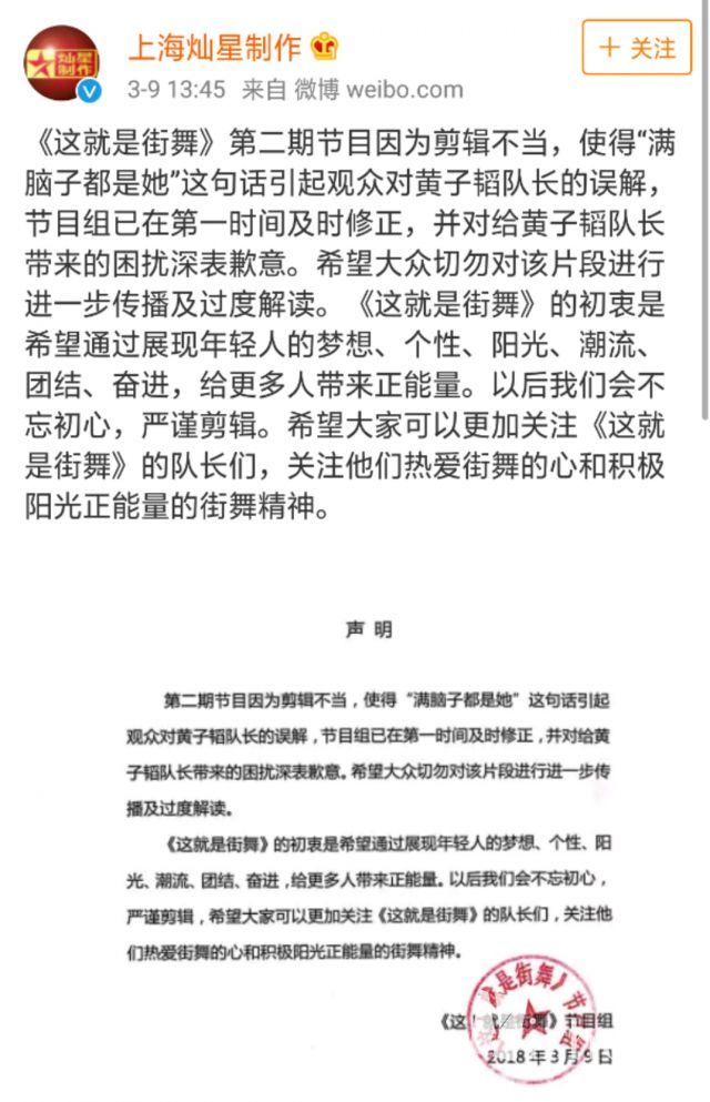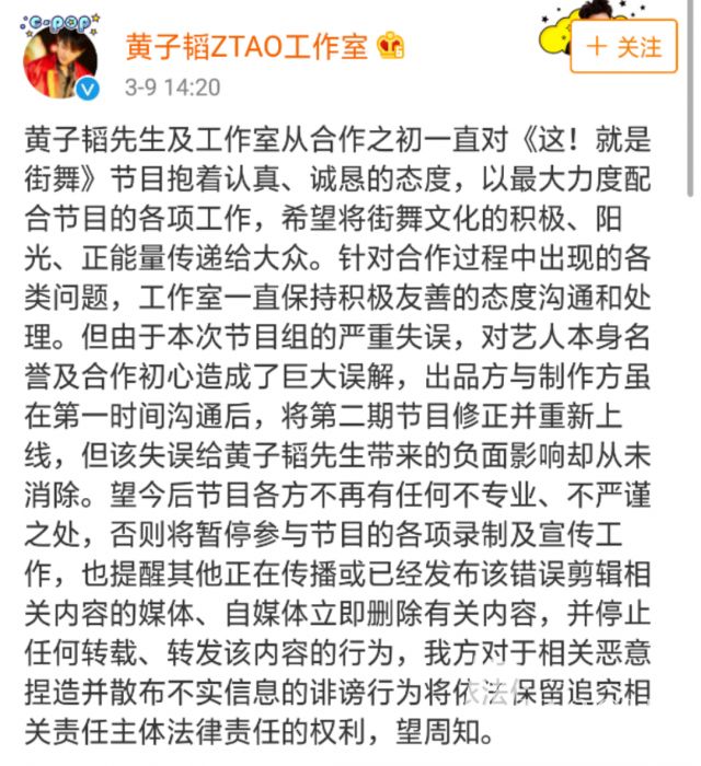 于是,毫不意外的,节目组收到了来自黄子韬工作室的“传唤”,要求道歉。