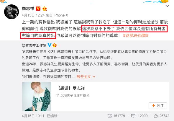 于是,迫于压力,节目总导演在个人号上发表致歉,罗志祥工作室和节目官微随后转发,这事儿才告一段落。