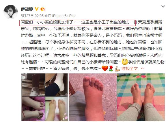孕晚期的妈妈多会水肿,脚特别的肿,所以会不便外出,而且乘坐飞机到美国要十几个小时,一般的人都需要好几天倒时差,但是对于经常外出的伊能静来说可能会容易一点点。