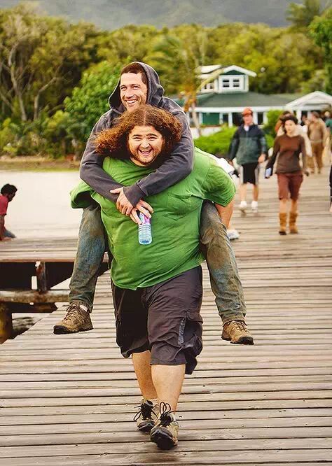 演员欢乐的在一起,大块头“Hugo”背着“Jack”