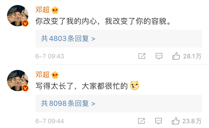 难得被老婆这么一本正经地表扬,可邓超呢?留言里的回复还是一副不着调的样子。