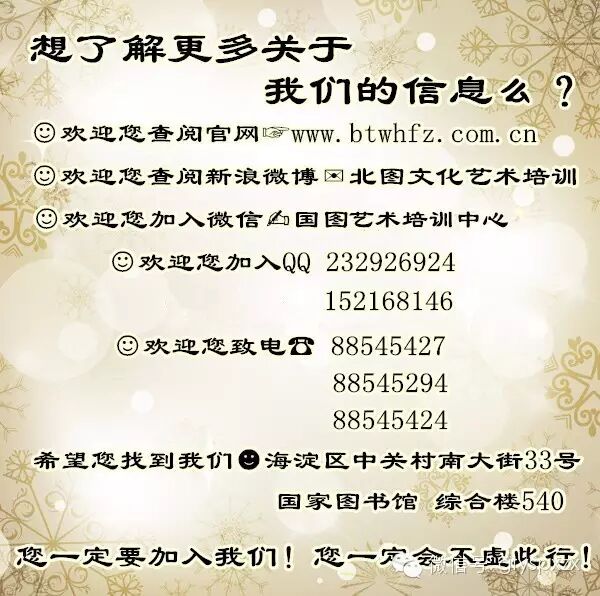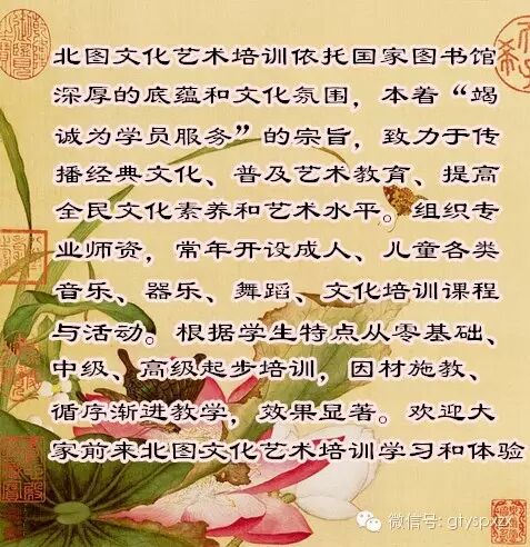 北图文化艺术培训依托国家图书馆深厚的底蕴和文化氛围,本着“竭诚为学员服务”的宗旨,致力于传播经典文化、普及艺术教育、提高全民文化素养和艺术水平。组织专业师资,常年开设成人、少年、儿童各类音乐、器乐、舞蹈、文化培训课程与活动。