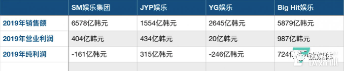 韩国经纪公司 Big Hit 旗下只有一支代表性偶像团体“防弹少年团”,但它2019年营业利润超过了韩国三家经纪公司SM、JYP、YG (以下简称为“三大”)2019年营业利润的总和。