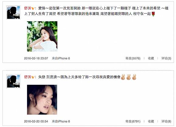 2月18日,舒淇[微博]微博发感慨,称期待一见钟情种下种子,等着人来灌溉。言语之中透露出打开心门,等待有缘人。而在2月20日凌晨,舒淇又配以美照发出爱情感慨:“失恋,别流泪~因为上天多给了你一次寻找真爱的机会。”