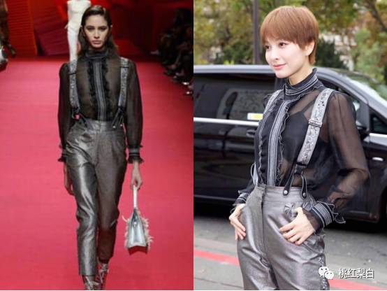 这身look即使是秀场模特穿起来,也并没有美到哪里去,吴昕穿起来就更加尴尬了。银色背带裤配透视丝质衬衣,廉价味浓重,还有种穿“大号童装背背裤”的既视感。