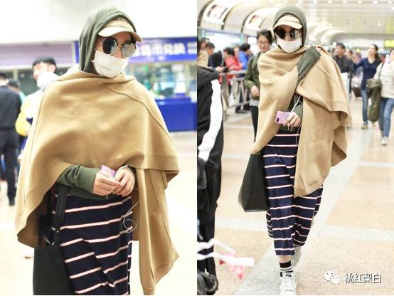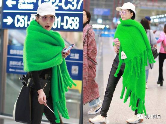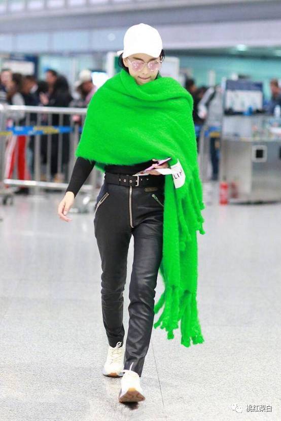 可能是对绿色难以言表的热爱 ,让她直接把自己穿成了 一只“青虫精”。白色帽子、荧光绿围巾,下面再来条大皮裤,绝对的“机场时尚女王”。(微笑)