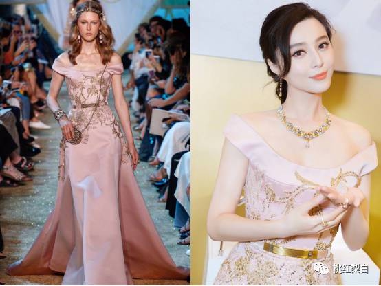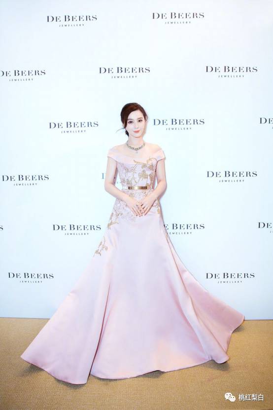 收获了De Beers的全球代言人,发布会当天必须要打扮美美的。这种露肩收腰大伞裙,就很适合范冰冰的身材,长腿和瘦身效果都有了,藕粉的颜色也衬的她的气色更好。