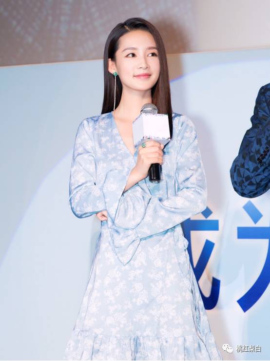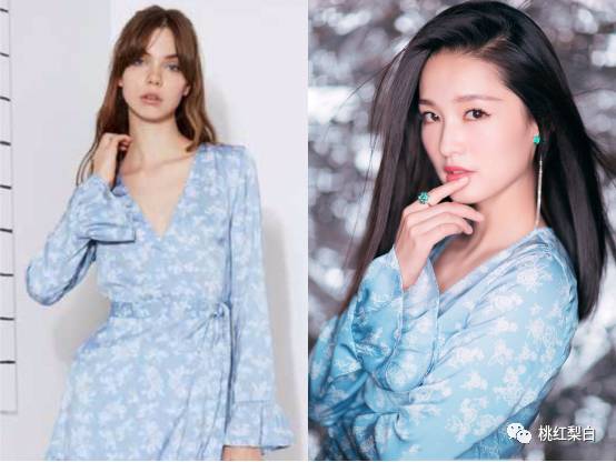 这种冰蓝色很适合李沁这种皮肤白皙的类型,虽然是大面积小碎花的款式,但冰蓝+纯白的配色丝毫不土气,反而有种质感很好的优雅气,小V领和短裙的设计也很match,整体看起来还是很舒服洗眼的。