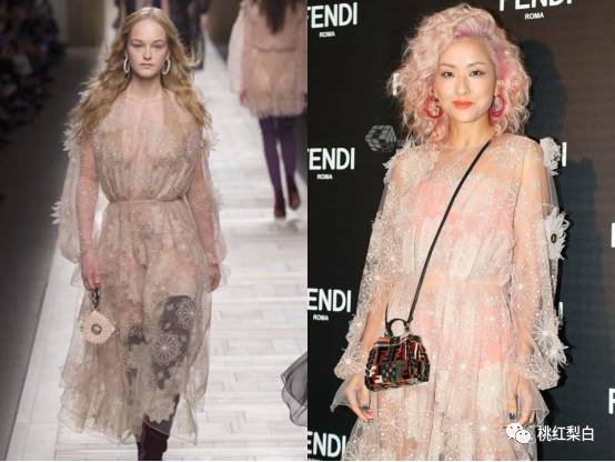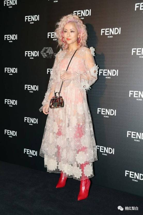 暂且不说这条裙子视觉上看起来有多膨胀,单就颜色来说,一头粉发+同粉色的连身纱裙,再来一双荧光亮红色尖头靴,整个人宛如一个“粉红色的胖版梅超风”。